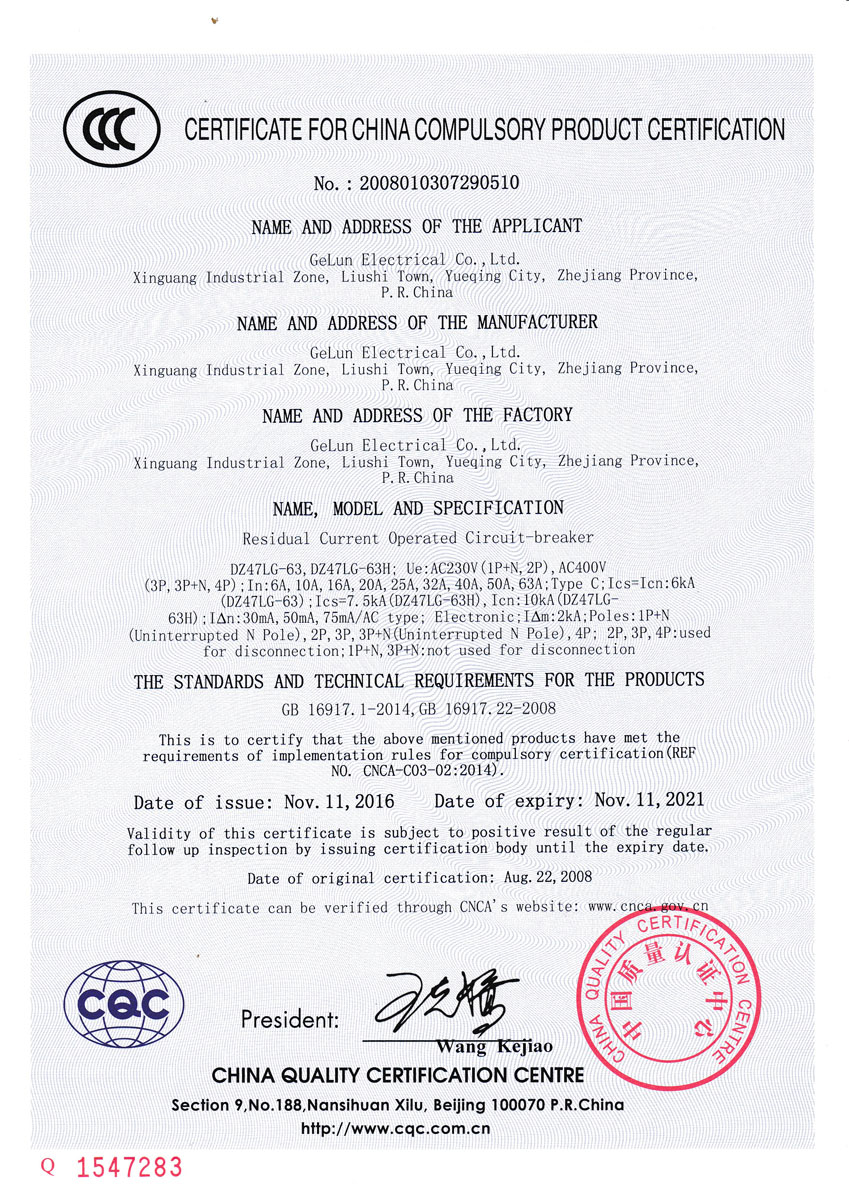 DZ47LG-63 series residual current operated circuit breaker is suitable for AC 50Hz, rated working voltage 230V (1P+N, 2P), 400V (3P, 3P+N, 4P), rated current up to 63A. The power supply neutral point is directly grounded in the electricity system. For the purpose of leakage protection, it can also be used to prevent fire hazard caused by grounding fault electric current due to equipment insulation damage. It can also be used to distribute electrical energy as well as protect lines and power equipment from overload and short circuit. The protection characteristic is C-type.