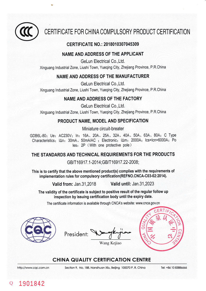 GDB6L-80 series residual current operated circuit breaker is suitable for AC 50Hz (60Hz), rated working voltage 230V, rated current up to 80A. The power supply neutral point directly grounded in the power supply system. It is used for the protection of human body’s electric shock, equipment leakage, overload, short circuit. It can also be used to prevent fire hazard caused by grounding fault electric current due to equipment insulation damage. The circuit breaker should be turned off when the leakage protection function needs to be turned off during line maintenance and checkup. It can also be used as an infrequent conversion of the line, and the protection characteristic is a C-type.