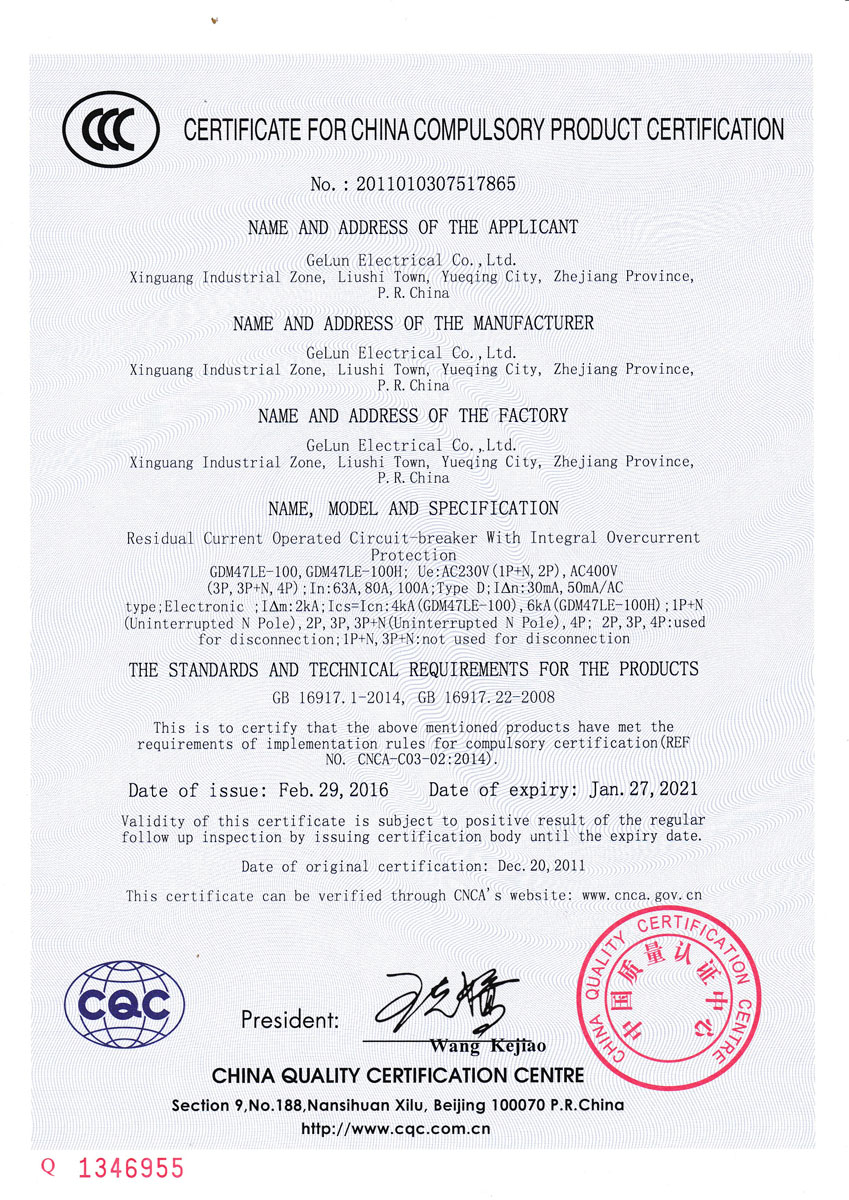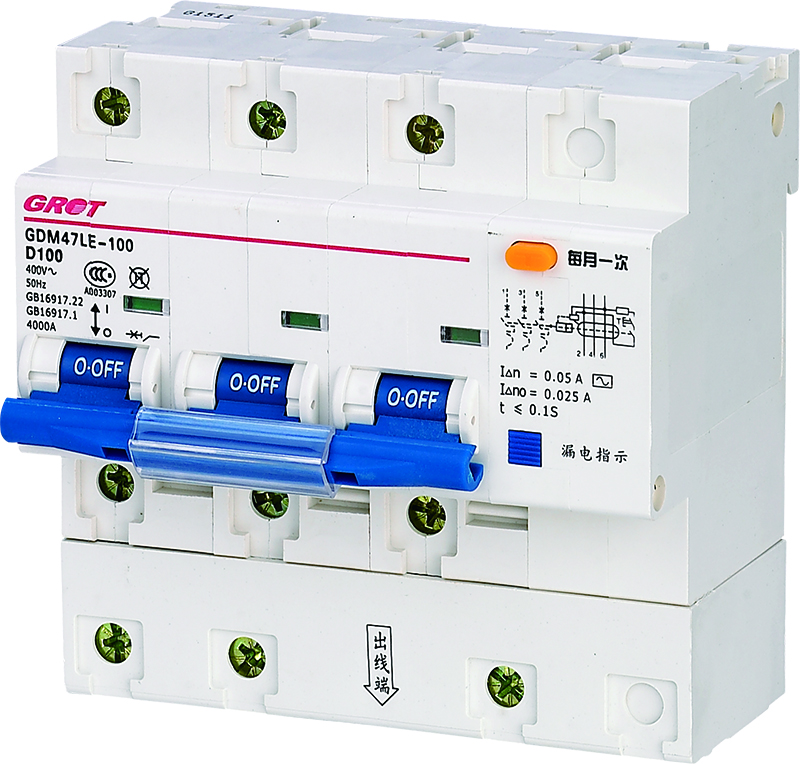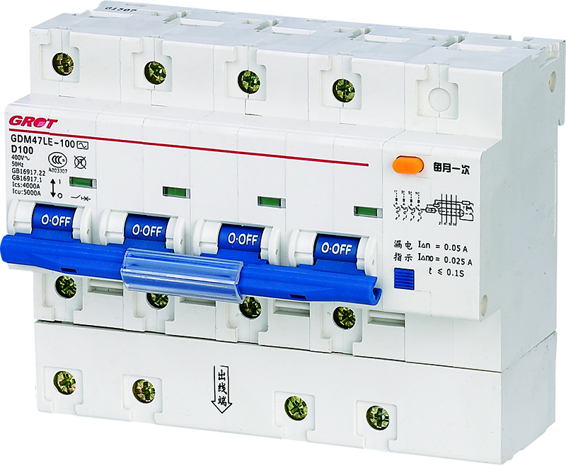 GDM47LE-100(H) series residual current operated circuit breaker is suitable for AC 50Hz, rated working voltage 230V (1P+N, 2P), 400V (3P, 3P+N, 4P), rated current up to 100A. The power supply neutral point directly Grounded power supply system. For the purpose of leakage protection, it can also be used to prevent fire hazard caused by grounding fault electric current due to equipment insulation damage. It can also be used to distribute electric energy and protect the line and power equipment from overload and short circuit. The protection characteristic is D-type. The circuit breaker complies with IEC1009-1, GB/T 16917.1, GB/T 16917.22 standard.
