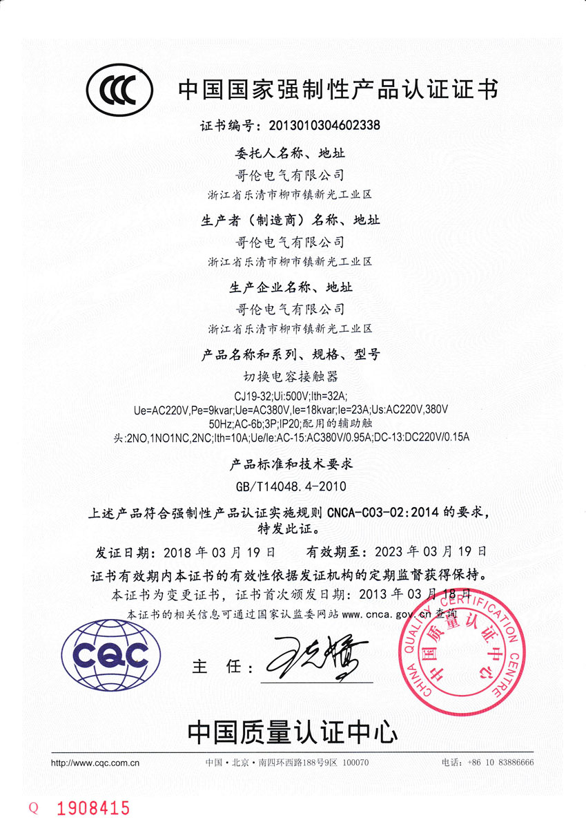 CJ19系列切換電容器接觸器主要用于交流50Hz或60Hz,額定工作電壓至380V,額定功率至50kvar的電力系統中,接通和分斷并聯(lián)電容器,以作為改善功率因數之用。